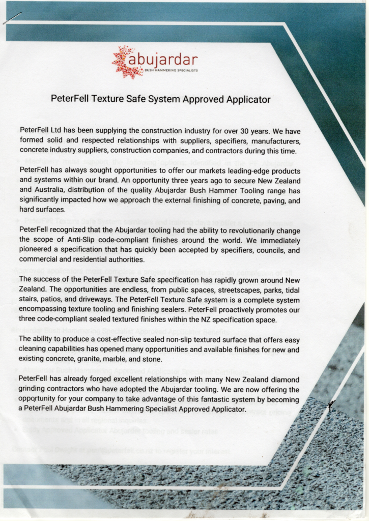 NZ Grinders Polished Concrete is an approved applicator for the Peter Fell Texture Safe System bush hammer system.